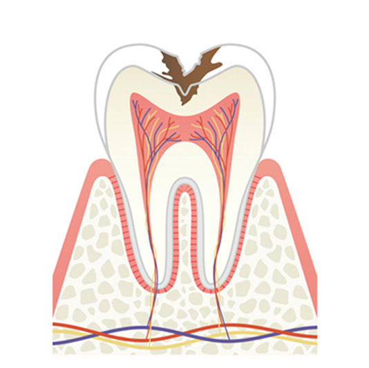 虫歯が象牙質に侵入すると、細菌は歯髄に近い部位まで到達します。象牙質は神経との距離が近いため、温度変化などの刺激に敏感になります。