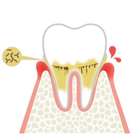 歯周病は、歯を支える歯ぐきや骨が細菌の感染により少しずつ破壊されていく病気です。歯垢(プラーク)の中にいる歯周病菌が原因で起こり、進行すると歯を失ってしまうこともあります。初期の段階では自覚症状がほとんどないため、定期的な歯科検診で早期発見・早期治療を心がけることが大切です。